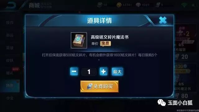 除了这个女娲尼罗河女神之外,在商城中出现了一个新的铭文礼包:高级铭文碎片魔法书,标价免费购买,不过限购一个。(这是体验服)