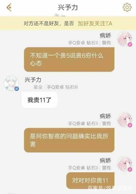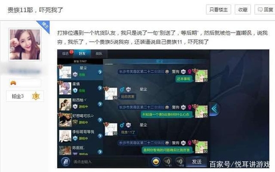 妹子称自己在游戏中遇到了一个完全不会玩的队友,一直在送人头,妹子实在看不下去,就说了一句“别送了,等后期”,然后就被他一直嘲讽,骂妹子穷,直到游戏结束后依然在嘲讽,妹子称自己只是没有设置显示贵族称号,其实自己贵族6,而他只是贵族5,妹子实在受不了,亮出了自己的贵族6,并且说了一句“不知道一个贵族5说贵族6的穷是什么心态”,而对方回了一句让妹子都蒙了,“我贵族11了”,哈哈哈。