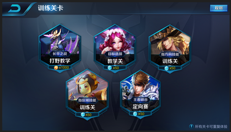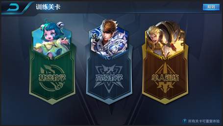 高级教学关卡新增了四个教学和训练关卡,分别为:目标选择教学、指方向技能训练、指区域技能训练、王者峡谷定向赛。