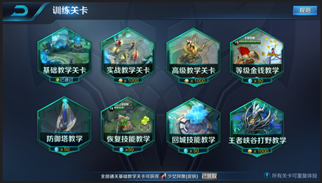 基础教学关卡新增了四个教学关卡,分别为:等级金钱教学、恢复技能教学、回城技能教学、防御塔教学。