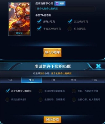点击【许愿】按钮弹出的面板中,可以先指定好友【许愿】(即以前的索要),选择【加入心愿单】,即可将皮肤加入心愿单;