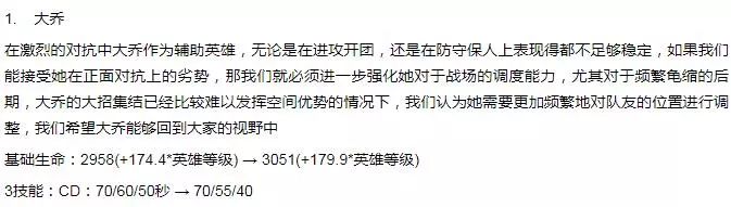 关于大乔策划明确的表过态,不会重做!这次减少了大乔的大招CD和基础生命值。只能说开黑推荐使用,如果单双排位没有配合,就相当于少一个人。