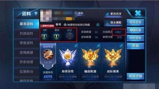 我们可以看到妹子的英雄数量62个,皮肤数量58,对战场次6891,差不多七千场,最高段位白银1。