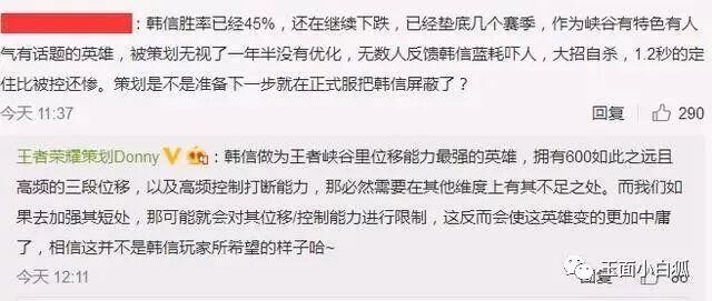 另外策划针对韩信的强弱问题再次做出回应,韩信胜率跌入倒数前三,但是韩信依然具备位移出众的特点,暂时不考虑直接增强韩信。而有玩家留言,获得上百点赞:韩信是一个被主播和职业选手支撑起的英雄!确实如此,韩信在低分段大多数都是酱油英雄,仅仅只在高操作玩家手中,才有发挥的余地。昨天小白狐也发了一个最废英雄前三,其中就有韩信,在普通玩家手里,韩信打团无力,很难依靠位移取胜。