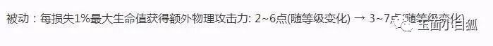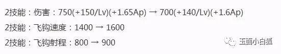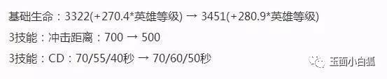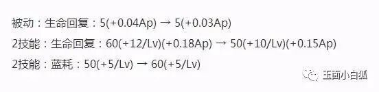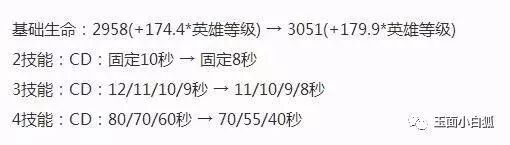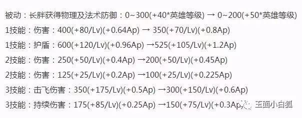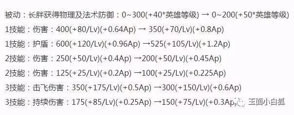 梦奇(大幅削弱):长肥后的防御削弱,1技能护盾值削弱,1/2/3技能伤害削弱,但法术加成提高。梦奇生存降低,伤害降低,不管是AD梦奇还是AP梦奇均被削弱,新英雄一去不复返了。