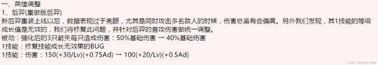 第一名调整的英雄是后羿,后羿这次重做可以说非常成功,有网友测试,叠加攻速之后甚至可以做到一秒十箭,这么高的攻速而且伤害还不低,瞬间抢完所有射手的风头,主要是手感还非常顺滑。叠加攻速之后,伤害比马可波罗都高,打击感又比马可波罗爽快,也难怪马可波罗越来越没有竞争力了。