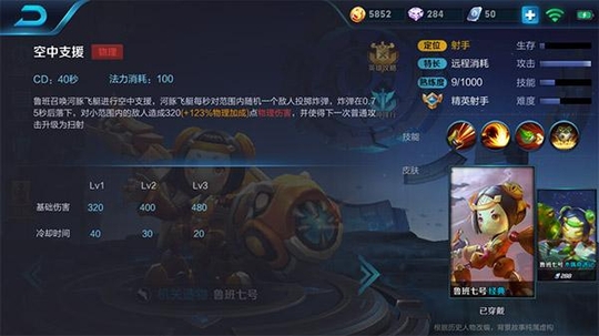 鲁班七号召唤出飞艇朝指定方向持续前进,飞艇可以对范围内敌人进行随机的投弹攻击,炸弹可以对小范围敌人造成不错的物理伤害。释放大招后下次普攻会升级为扫射。