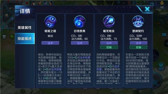 日蚀祭典(一技能):东皇太一的核心技能,产生黑暗能量体,最多三颗,萦绕在身体周围,命中单位即可返还一半的冷却时间,对靠近的敌军产生一定的伤害,并且可以触发被动,回复自身血量,提高自身生存能力。