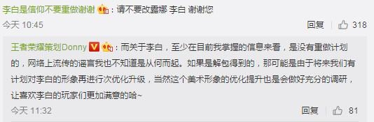 在王者荣耀策划的微博下面,有小伙伴留言不要重做露娜和李白,而策划对此的回应则十分耐人寻味:三句长回复尽是关于李白,而有关露娜却只字不提!