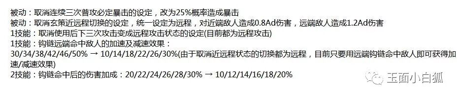 玄策大幅削弱:必定暴击被移除,伤害大幅降低,近战改为远程,距离越远伤害越高,已经可以当射手打了,这刺客变射手的定位有点尴尬。