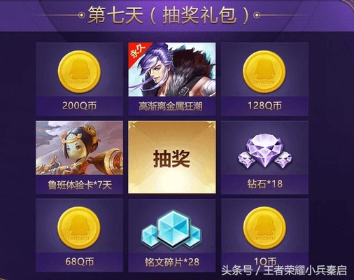 如图一所示,只要连续签到七天,就可以抽取礼包,而且这次礼包有一半是Q币的奖励。最低也可以获得铭文碎片和钻石。最高奖励是200Q币,虽然几率渺茫,但是过程很重要,我们再往下看。