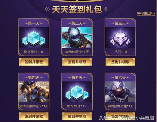 图二才是我们关注的重点,每天签到就可以得到碎片和体验卡。宫本三天的体验卡和扁鹊皮肤3天的体验卡都不错,最关键的是,可以重复获取!