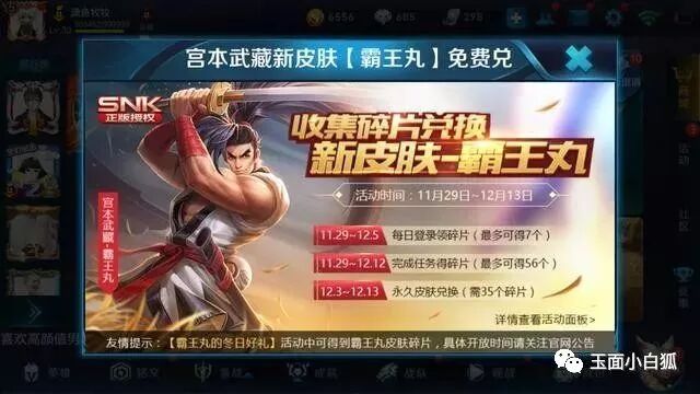 3、每日实战(人机除外)击杀20小兵和获胜两场可分别领取两个霸王丸碎片,这里一天可以获得4个,最多获得56个;这样算下来,如果不参加冬日好礼糖果屋活动,每天最多获得5个碎片,那么需要7天才能获得35个霸王丸碎片,耗时较久。
