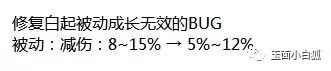白起:正式服中白起存在BUG,免伤值一直为8%,这一次修复之后,降低了前期的免伤百分比,增加后期的免伤百分比;