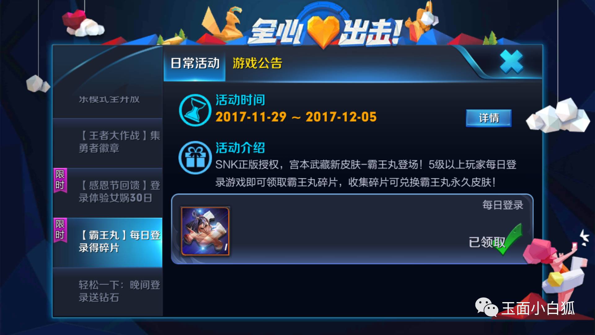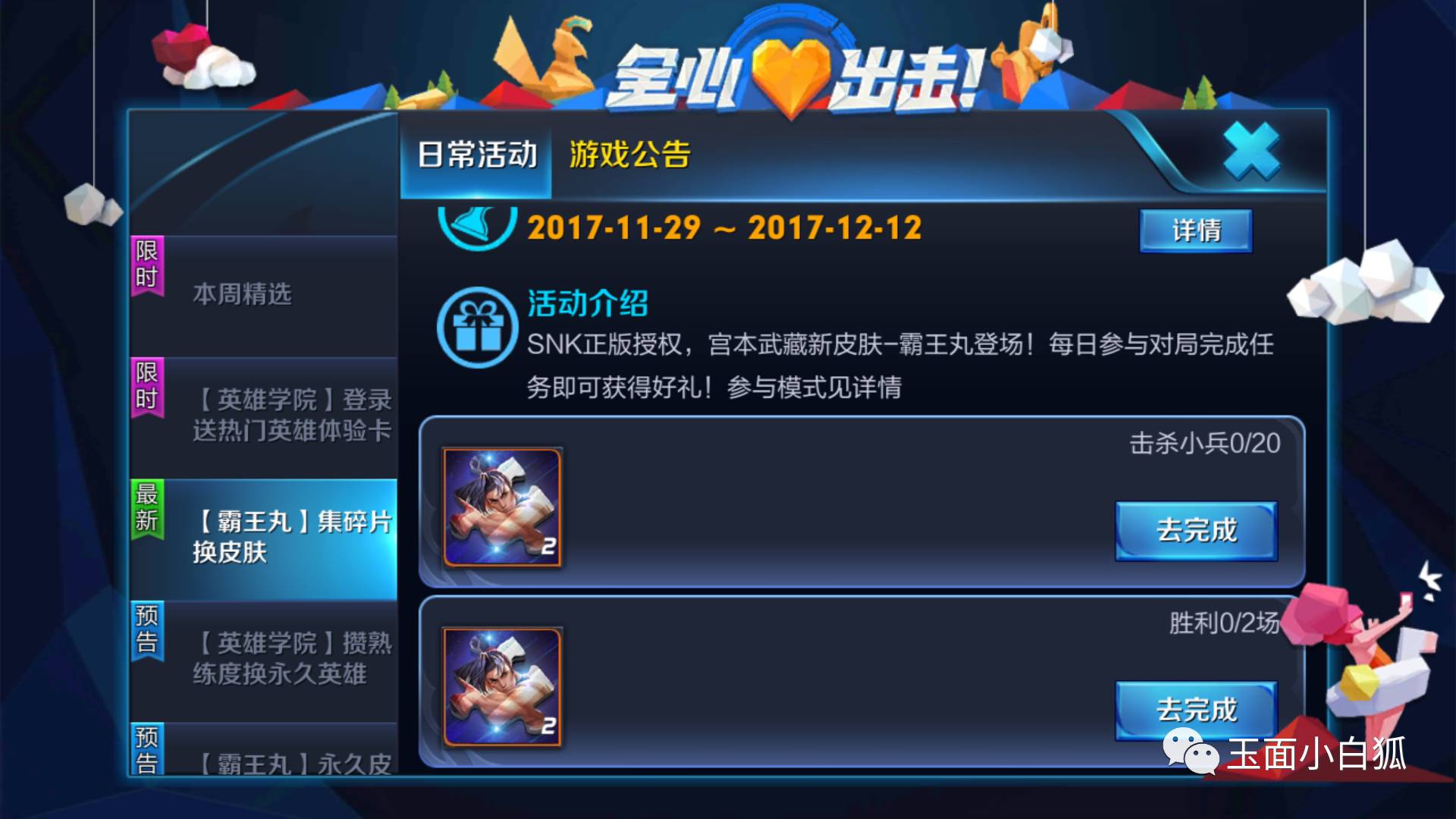 如果大家每天坚持获取霸王丸碎片,最慢七天就可以拿到皮肤,最快就要看在冬日好礼中抽到多少霸王丸碎片了。努力,加油吧!!!最后提一下,这个活动就算没有宫本武藏也可以获得皮肤,使用体验卡或购买英雄后,皮肤会自动解锁。