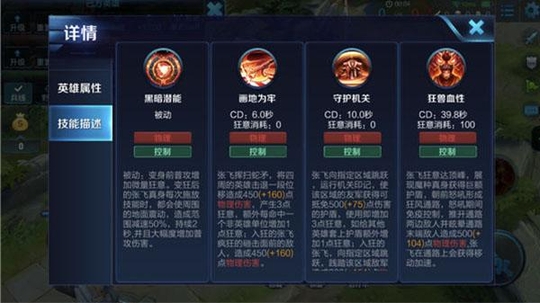 张飞没有法力值,取而代之的是狂意值。张飞每次普攻都可以获得少量狂意值,变身后每次释放技能都可以造成范围减速效果,并能够提高普攻的伤害。张飞虽然是坦克英雄,但在开大之后会拥有不俗的输出能力,同时可以极大干扰敌方的团战的阵形。