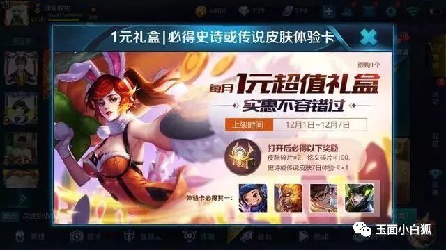 王者荣耀每月初都会放送一次福利,即为1元超值礼盒,这个礼盒对于豹子头零冲来说不算福利,但对于会小充的玩家就是一个福利活动。1元可以开出2个皮肤碎片+高品质皮肤体验卡7日,怎么买都划算,不过本次福利有所降低,加入了史诗皮肤体验卡,相信多数玩家抽到的都是诸葛亮的史诗皮肤体验卡吧。