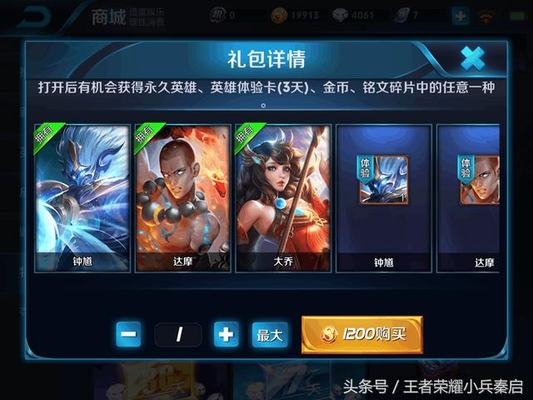 图一是这一次宝箱的三名英雄,分别是钟馗、达摩和大乔,和之前的玩法一样,如果这三名英雄你都没有的话,那么建议可以一次购买三个宝箱, 一次性打开,无论是否获得,都应该收手,只买一次,这是入坑一年的经验呀!