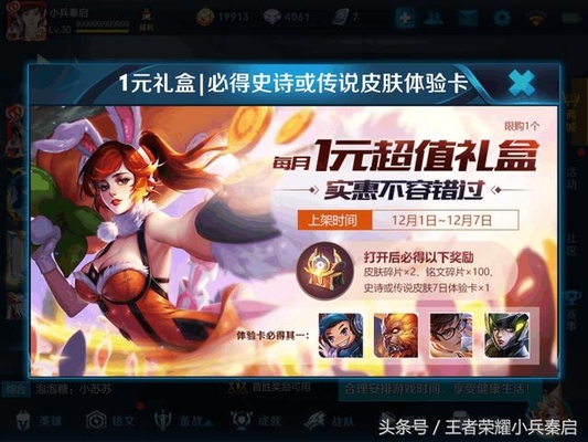 1元超值礼盒又上架了。时间是一个礼拜,只要充值1块钱,打开必得两枚皮肤碎片和100枚铭文碎片以及最高级别的七天皮肤体验卡一张。其实这个活动还是满划算的。虽然很多玩家自喻为零充党,但是这个1元礼包还是会入手的。
