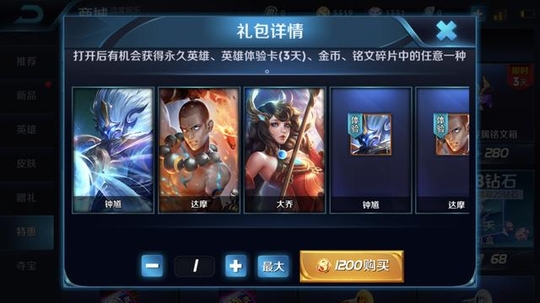 幸运英雄宝箱再次开启,1200金币,有机会开出永久英雄达摩、大乔、钟馗。有人说这个活动很坑,根本开不到英雄。但是今天有小伙伴一次就开出两个英雄。