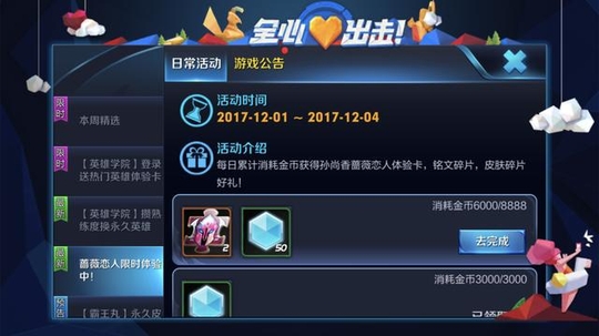 另外官方还上线了消耗金币的活动,累计消耗5888金币可获得孙尚香蔷薇恋人体验卡,和铭文碎片。