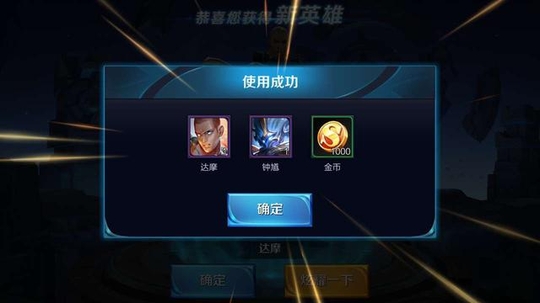 玩家本来也是抱着试一试的态度,结果...............开出达摩和钟馗两个英雄,还有1000金币。也就是200金币买个两个永久英雄。抽完后玩家乐坏了,村长就没有这么好的运气了,抽到的都是英雄体验卡和铭文碎片。