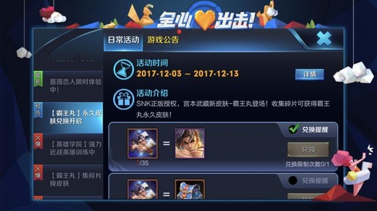 另外霸王丸皮肤12.3日开启兑换,只需要35个霸王丸碎片就可以获得一个免费永久皮肤。活动截止时间到12.13日。大家一定不要错过了。