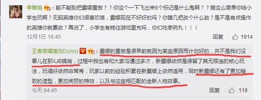 玩家似乎还不能接受露娜重做的事实。官方称露娜重做是很早以前就计划好的,并不是一时兴起,新露娜依然保留了无限连的核心玩法。同时还有了更加精致的造型,更加绚丽的特效。