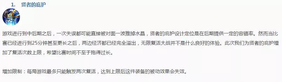 在抢先服的公告里已经把贤者庇护(复活甲)改成了一局只能复活两次。如果达到上限,被动效果就会失效。