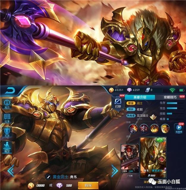 典韦黄金武士:冲锋造型改成指挥造型了,特长收割很显然,再也别拿典韦当坦克打了,这是一个收割型战士英雄。