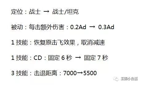 达摩增强:更改定位为战士/坦克,回滚1技能击飞效果,1技能冷却时间加长1秒,大招击退距离降低五分之一,控制能力下降,被动伤害增加;