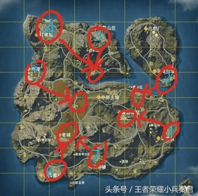 图三所示划出了资源相对丰富的几个地方,至于中部主城为啥没圈出来,毕竟那是兵家必争之地,竞争最激烈的地方,要是咱们的团队五人中,人人都是吃鸡老手,当我没说,直接就跳主城硬杠吧!