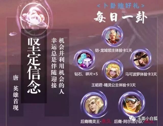 王者荣耀明世隐已经上线一天,其相关的抽奖活动也在昨日开启,这段时间的活动奖励非常丰富。而明世隐这个卜卦活动,更是拿出了后羿的精灵王和阿尔法小队永久皮肤,每天只需要登录游戏即可获得抽奖资格,但这个活动是QQ专属!不过微信用户有另外的抽奖活动,文章末尾附上。