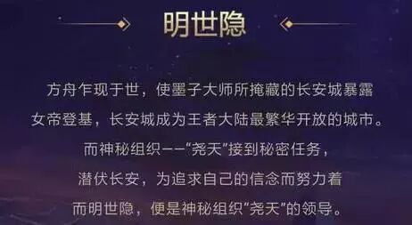 明世隐的上线,王者荣耀正式拉开了“盛世长安”新版本的序幕。而在明世隐的背景中,有一个神秘组织浮出了水面——“尧天”。