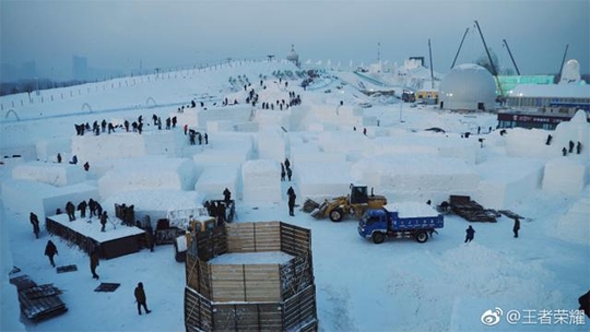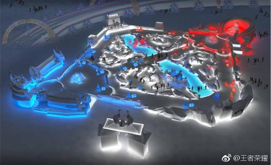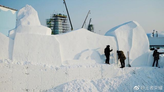这次,王者峡谷的造型又被勤劳智慧的哈尔滨人民看中了! 在哈尔滨冰雪大世界上,他们造了一个巨型大冰雕,几乎完美还原王者荣耀地图的全貌。