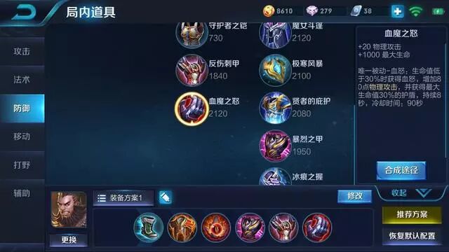 这套出装比较的万能,如果对面法师是最肥的。建议把反甲换成魔女斗篷,把反甲看成一件攻击装备即可。另外补充一点,千万不要出霸者重装,随时保持半血左右的状态你才是最强的。