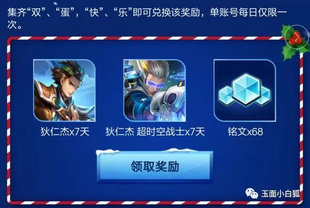 活动奖品:永久圣诞狂欢皮肤+双蛋快乐四个字(集齐兑换7天传说皮肤体验卡)