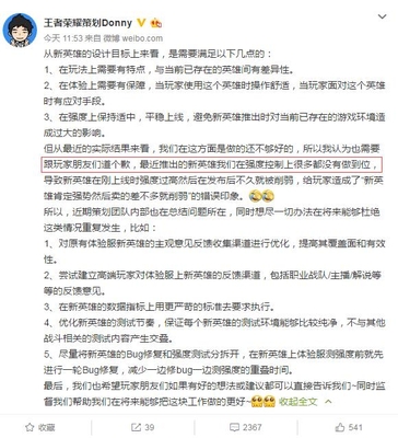 这条微博内容很长,大体将了三个方面。一个是新英雄的设计目标;一个是为目前大多新英雄太强为玩家们道歉;一个是在体验服加强新英雄强度测试和反馈的方法。