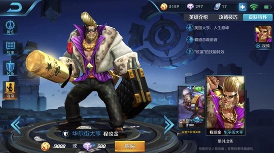 当前版本已经是战士和坦克的天下,程咬金加强后成为了版本的大boss。一个2技能切入战场,没血了再利用1技能逃走,接着开启大招,边走边回血,给敌人来个惊喜。这款皮肤全新的技能特效,还有霸道总裁语音。288点券买了绝对不会后悔。