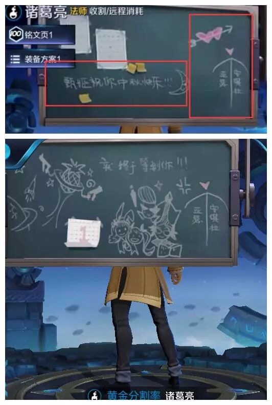 可以看到诸葛老师背后的小黑板上的内容已经发生了变化,从中秋快乐变成了几个英雄的涂鸦。而这个涂鸦正好是元旦将要开启的皮肤礼包,开黑小队。