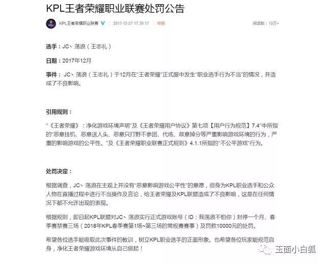 王者荣耀近日职业选手荡浪因涉嫌故意掉分,被各路玩家狂喷不止,甚至有玩家举报到官方。KPL王者荣耀职业联赛官方随后对其进行调查,今日下午处理结果已公布,荡浪确实有不当操作,因为其身份特殊,所以对其进行了严肃处理。