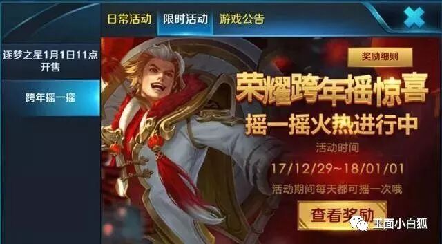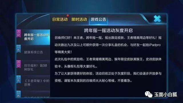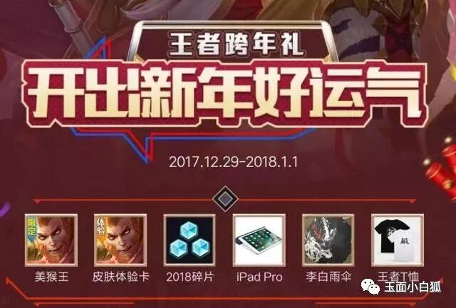 摇一摇活动奖品:iPad Pro、永久皮肤美猴王、新年头像框宝箱、李白雨伞、T恤、英雄碎片、改名卡、新年礼包,等等。