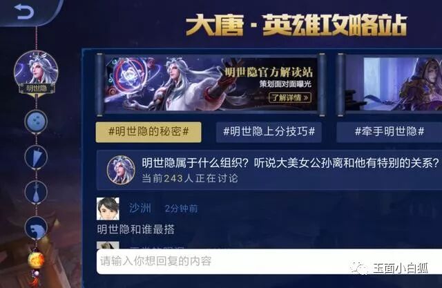 王者荣耀盛世长安版本已更新许久,近日官方在社区内预热了此版本的全部新英雄,此页面被称之为大唐英雄攻略站。而在该页面左侧方,隐藏着今日所要揭晓的秘密,其中明世隐的头像已经挂上去了,其他有都代表着新英雄,这些新英雄都属于尧天组织!