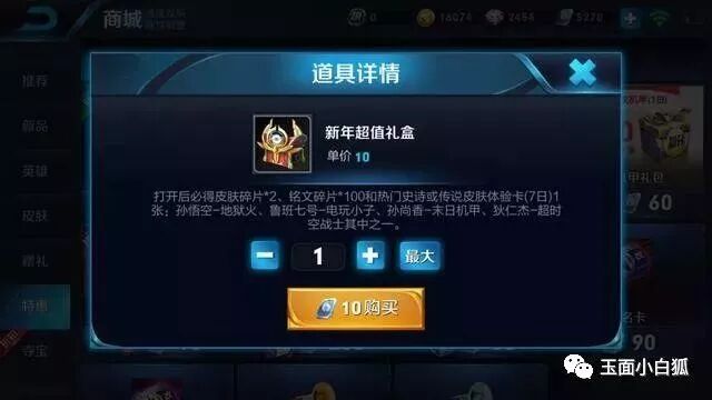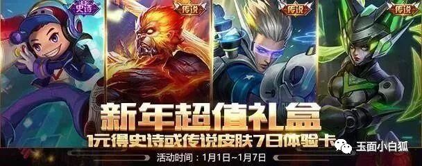 新年礼盒也就是1元礼盒,在商城特惠中购买,可以抽到地狱火、电玩小子、末日机甲、超时空战士的体验卡7日,另外还必得2个皮肤碎片,是目前最划算的礼盒,没有之一。搭配上述充值活动,充值1块钱,即可拿到3个皮肤碎片与高品质皮肤体验卡7日。