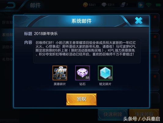 今天是2018的第一天,小编先祝各位小伙伴们元旦快乐!新的一年,王者荣耀自然也不会错过这个机会,各种礼包各种活动让你眼花缭乱,有Q端的,还有微端的。中午的时候,系统也给每一位小伙伴赠送了3枚英雄碎片+88钻石+88铭文碎片,咱们也别嫌弃了,总比没有得强。