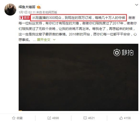 那时候,大锤哥还是一个默默无闻,独自努力的小主播,粉丝只有300,微博也没人评论。但 经过3个月的努力,开始有粉丝在这第一条微博下表示喜爱。