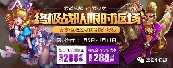 1月5日~1月11日两款限定皮肤返场,售价仅需要288点券,明日凌晨零点即可购买。众多小伙伴们一致认为,这几款皮肤的收藏价值高于实用价值,如果不缺点券还是可以入手的。另外张良的天堂福音和孙尚香火炮千金将在第二弹返场,差不多就是十几号的样子吧,下周五有可能会开启。