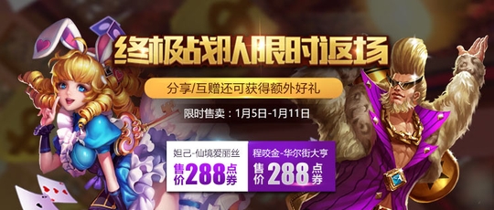 明天正式返场的是我们的 “土豪金” 华尔街大亨 与小仙女 仙境爱丽丝 ~这次的皮肤均可以 赠送 哦,各位赶紧记下妲己宝宝的账号 ~哔~(被老亚瑟沉默)