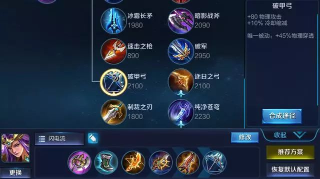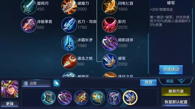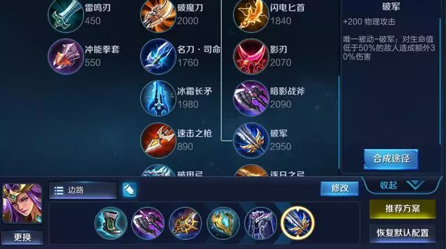 边路雅典娜的话,就没有蓝BUFF加成了,所以选择一个极寒保证耗蓝以及冷却减少,边路英雄要半肉不能全怼输出,保证自己的发育速度,前期清线要快,等兵线一条之前时,一抢戳过去,再推盾收兵。