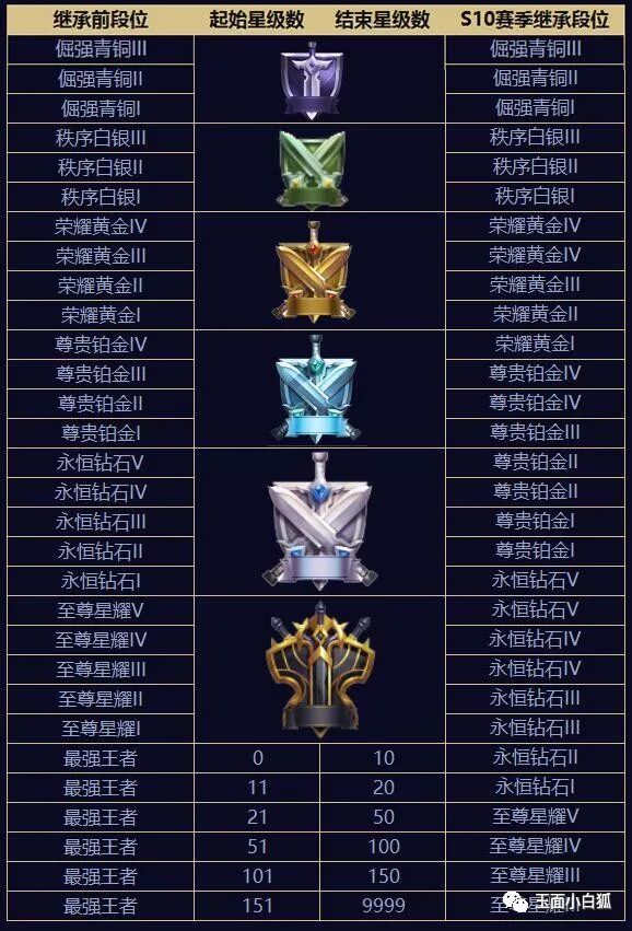 段位继承图如下:按照当前实际段位继承,第一竖排是当前段位,第三竖排是继承后的段位,最高继承至星耀3。